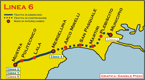 In origine era la Linea tranviaria rapida (Ltr), mezzo di collegamento tra il centro e la periferia ovest, doveva essere pronta per i mondiali di calcio del 1990. Invece lo scavo si allagò e divenne uno dei tanti scandali di Tangentopoli. Nel 2006, dopo 10 anni di stop, l’Ansaldo trasporti firmò per la ripresa dei lavori cambiando il progetto in Linea 6: sei chilometri di servizio interamente sotterranei, fine lavori nel 2009, costo previsto all’epoca 390,96 milioni di euro.